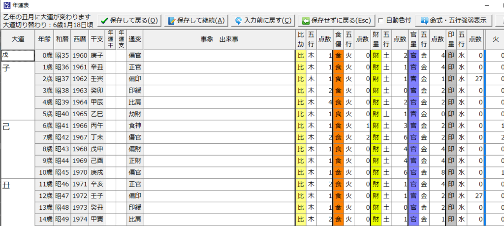 事象・出来事を入力する欄がありますが、ここは自由に入力できます。また、大運の切り替わり時期を画面上部左側に自動で表示してます。この画像では、「壬年の戌月に大運が変わります。大運切り替わり 4歳11月1日頃」と表示されてます。画面右半分は五行(通変星)と、その点数が表示されます。通変星の項目の箇所にてマスに色が付いてますが、ここの色は自由に変更できます(何も色を付けないことも可能です)。